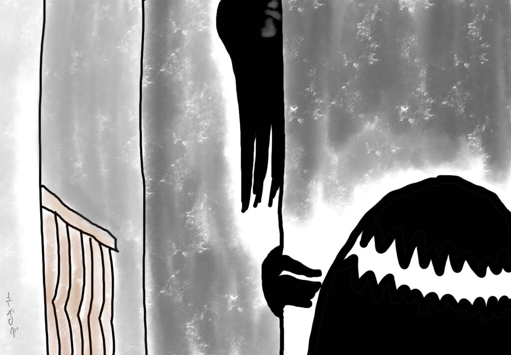 ドア越しに話しかける女。