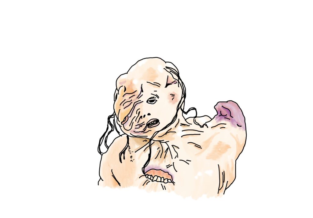 番組オーディションで審査員が言っていた「顔に胸がついていればな」という言葉どおり、エリザスーの顔から胸がこぼれ落ち、下品なプロデューサーが「50歳で…止まる」と言った言葉に答えるかのように、消防車の如く噴き出る血液。